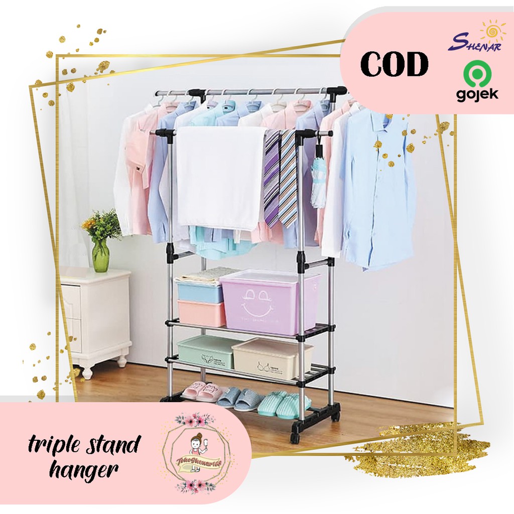 Promo Perlengkapan di Kabupaten Lebak (cod) Triple Stand Hanger Stainless 3 Susun 2 Sisi Dilengkapi Roda Serbaguna - Shenar dari Tidak Ada Merek Kota Jakarta Utara
