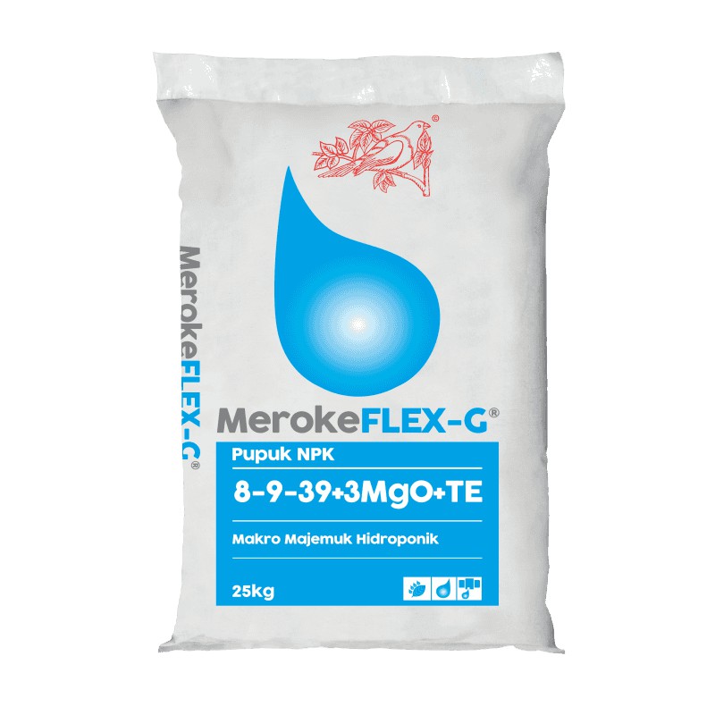 MerokeFLEX-G® bila dikombinasikan dengan MerokeCALNIT® dan MerokeMAG-S® akan menjadi perpaduan yang baik untuk meracik AB-Mix di beberapa jenis tanaman yang ditanam dengan sistem hidroponik.MerokeFLEX-G® dapat digabungkan dengan yang lain kecuali MerokeCALNIT® dalam membuat pekatan AB-Mix.Kandungan MerokeFLEX-G®:- Total Nitrogen (N) 8,0 %= Nitrat-Nitrogen (NO3-N) 8,0 %= Amonium-Nitrogen (NH4-N) 0,0 %= Urea-Nitrogen (NH2-N) 0,0 %- P2O5 9,0 % (3,9% P)- K2O 39,0 % (32,4% K)- Magnesium Oksida (MgO) 3,0 % (1,8% Mg)- Sulfur Oksida (SO3) 10,0 % (4,0% S)- Sulfur (S) 4,000 %- Boron (B) 0,029 %- Molibdenum (Mo) 0,005 %- Cu-EDTA 0,006 %- Fe-DTPA 0,140 %- Fe-EDDHA 0,010 %- Mn-EDTA 0,050 %- Zn-EDTA 0,032 %MerokeFLEX-G® adalah pupuk majemuk lengkap larut air yang di formulasi khusus untuk pertanian hidroponik.MerokeFLEX-G® mengandung nutrisi Mikro lengkap dalam bentuk kelat dan sangat ideal dipakai untuk sistem fertigasi (hidroponik) karena Nitrogen-nya hanya mengandung N-Nitrat (NO3) dan tidak mengandung Urea.Kalium untuk produksi & kualitas panen:- Kalium mengatur keseimbangan air dalam sel dan kehilangan air melalui transpirasi.- Merangsang pertumbuhan batang yang kuat.- Lebih tahan terhadap hama dan penyakit.- Berperan dalam pertumbuhan bunga dan buah.- Meningkatkan warna, rasa dan kualitas daya simpa buah dan say