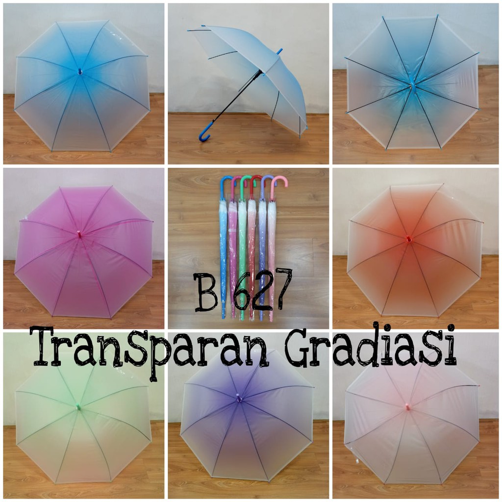 PAYUNG TRANSPARAN GRADIASI- BAHAN NYLON - DIAMETER : 39"- PANJANG : 75 CM- JARI - JARI : 8 - PEGANGAN TERBUAT DARI PLASTIKPAYUNG TIDAK REMBESMOHON CANTUMKAN WARNA CADANGAN #PAYUNG #PAYUNGGRADIASI #HUJAN #PANAS #GRADIASI #PL