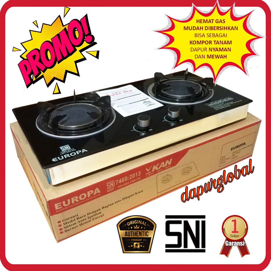 Harga promo !!!Plus free packing bubble wrap, styrofoam plus box*berat pengiriman hanya 10KG sesuai Dimensi produk ( bukan 11 atau 12kg seperti toko lain - anda bisa cek pada saat anda checkout barang, berapa berat barang yang tertera pada masing2 toko)Barang yang kami kirimkan pasti sesuai dengan gambar yang kami pajang.Fitur Kompor Gas INFRARED EUROPA :- Sudah SNI- Api besar dan merata, membuatmasakan lebih cepat matang dengansempurna- Kompor gas otomatis dengan teknologibara infrared, api besar cocok untuk fastcooking- Permukaan kaca sangat kuat tahanbeban hingga 80KG, tahan goresdan mudah dibersihkan- Panel kompor terbuat dari anodizedstainless sehingga tidak berkarat, lebihawet dan mewah- Material pipa berbahan dasar kuningan(anti karat dan menghasilkan api biruyang merata)- Dengan teknologi bara infraredotomatis, pemakaian gas rendah danoptimal==========================Keungulan kompor INFRARED EUROPA :1.Pembakaran yang sempurnamemastikan penggunaan gasberlangsung efisien.2.Nyala api bara membuat api tidakmudah padam walau terkena hembusanangin kencang.3.Hemat gas hingga 40%4.Mencegah timbulnya gas karbonmonoksida ( CO ) dan nitrogen oksida( NOx ) dari gas yang tidak terbakaryang dapat memicu penyakit berat.5.Tidak membuat hitam dasar peralatanmasak juga perkakas dapur danlingkungan sekitar.6.Dengan desain yang eksklusif, kompordilapisi kaca semakin mudah untukdibersihkan.Ukuran kompor sbb:P 72 x L 37.5 x T 8 cm.PackagingP 78 x L 44.5 x T 16,5MERK : EUROPABarang yang kami jual adalah WYSIWYG yang artinya adalah : What You See Is What You Get, karena foto yang kami pajang adalah foto asli produk yang akan anda terima, barang kami pastikan asli, baru dan dikirim dalam keadaan utuh dan bagus.Terima kasihDapurG