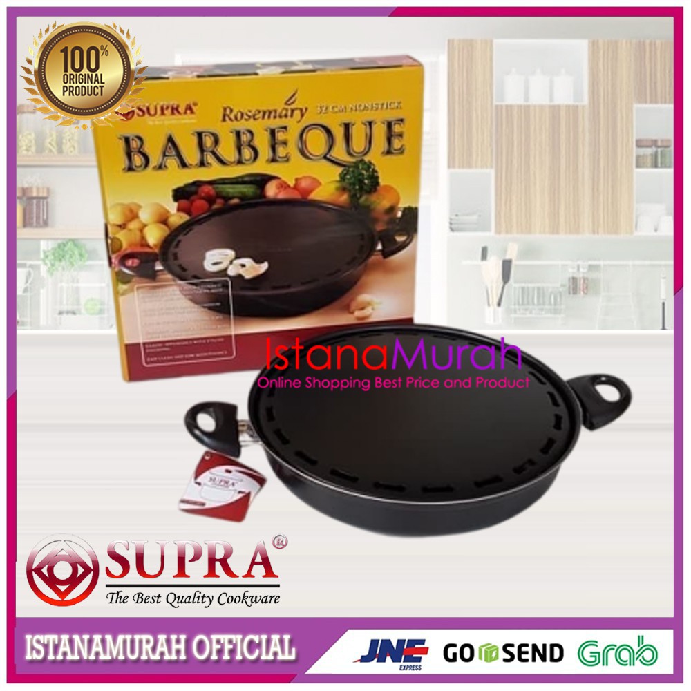 PANCI BBQ Pemanggang SUPRA 32CM / GRILLPAN BARBEQUE / ALAT PANGGANG TEFLON--------------------------------------------------------------------------------------------------SUPRA peralatan memasak dan dapur yang memenuhi standar kualitas international--------------------------------------------------------------------------------------------------* lapisan atas teflon anti lengket* pada bagian atas terdapat lubang agar minyak bisa menetes kebawah* khusus untuk kompor gas / minyak (yg ada api)* api langsung menyentuh bagian pemanggang sehingga cepat matang* bahan aluminium* handle tidak panas* mudah dibersihkan* diameter 32cm* tinggi 6cmTIPS:* wadah bagian bawah sebaiknya diberikan air agar tidak banyak asap akibat jatuhan minyakBARANG SUDAH DICEK SEBELUM DIKIRIM, ****Istanamurahofficial Shopee Adalah Akun Resmi Milik ISTANAMURAH****NOTE : ADD CART BUBBLE WARP UNTUK KEAMANAN PACKINGhttps://shopee.co.id/product/110549628/1830429647/*****NB :Tanggal merah / hari minggu LIBUR tidak ada aktifitas pengiriman.Kantor Kami Buka Dari Jam 09.00 Pagi - Tutup Jam 16.30********UNTUK PEMESANAN KETOKO / NEGOSIASI Silahkan Chat Kami Dahulu****TERIMA KASIH , HAPPY SHOPPING--------------------------------------------------------------------------------------------------SUPRA peralatan memasak dan dapur yang memenuhi standar kualitas international--------------------------------------------------------------------------------------------------* lapisan atas teflon anti lengket* pada bagian atas terdapat lubang agar minyak bisa menetes kebawah* khusus untuk kompor gas / minyak (yg ada api)* api langsung menyentuh bagian pemanggang sehingga cepat matang* bahan aluminium* handle tidak panas* mudah dibersihkan* diameter 32cm* tinggi 6cmTIPS:* wadah bagian bawah sebaiknya diberikan air agar tidak banyak asap akibat jatuhan minyakBARANG SUDAH DICEK SEBELUM DIKIRIM, ****Istanamurahofficial Shopee Adalah Akun Resmi Milik ISTANAMURAH****NOTE : ADD CART BUBBLE WARP UNTUK KEAMANAN PACKINGhttps://shopee.co.id/product/110549628/1830429647/*****NB :Tanggal merah / hari minggu LIBUR tidak ada aktifitas pengiriman.Kantor Kami Buka Dari Jam 09.00 Pagi - Tutup Jam 16.30********UNTUK PEMESANAN KETOKO / NEGOSIASI Silahkan Chat Kami Dahulu****TERIMA KASIH , HAPPY SHO