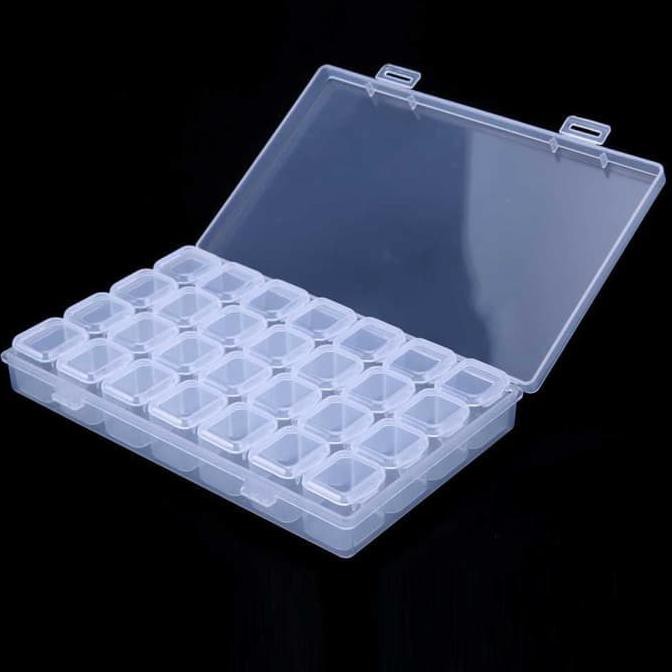 Warna: Putih transparanKotak untuk menyimpan perhiasan ini terdiri dari sebuah kotak besar dan didalamnya terdapat 28 buah kotak-kotak kecil. Dengan kotak ini, Anda dapat menyimpan berbagai macam perhiasan kedalam kotak kecil sehingga tidak bercampur dan mudah dicari lagi.Ukuran: 17 x 10.5 x 2