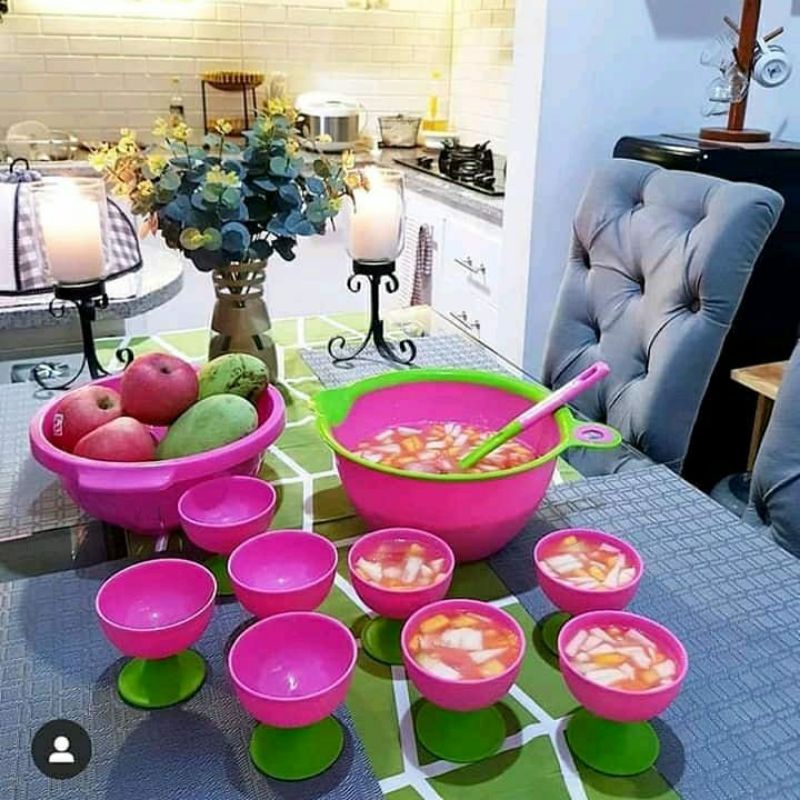 Vienna Maribella Bowl Set of 11 pcsSolusi untuk kesegaran yang ceria!Vienna Maribella Bowl Set of 11 pcs,produk baru dari seri Vienna yang bikin hati langsung ceria.Dengan perpaduan warna pink dan hijau cerah, Vienna Maribella Bowl Set of 11 pcscocok untuk menghidangkan kesegaran untuk orang tersayang. Cocok juga untuk momen arisan atau saat menjamu tamu di rumah. Buat sajian berbuka atau kumpul2 bareng keluarga besar atau sahabat tercinta.Vienna Maribella siap membawa kesegaran untuk Anda semua...Keunggulan produk ini :- Wadahnya JUMBO dengan kapasitas 4 liter- Material plastik PP5, dgn Food Grade dan BPA Free (Aman untuk makanan dan minuman)- Lengkap dengan 8 gelas dan centong- Warnannya catchy dan fresh bangettttt-Pegangan di kedua sisi wadahVienna Maribella Bowl Set of 11 pcs terdiri dari :- 1 pcs wadah saji JUMBO, kapasitas 4 liter. Diameter: 26.5 cm, Tinggi: 12.5 cm- 1 pcs wadah tempat buah (bisa jadi peniris). Diameter: 26 cm, Tinggi: 11 cm- 8 gelas saji, kapasitas 150 ml.- 1 ce