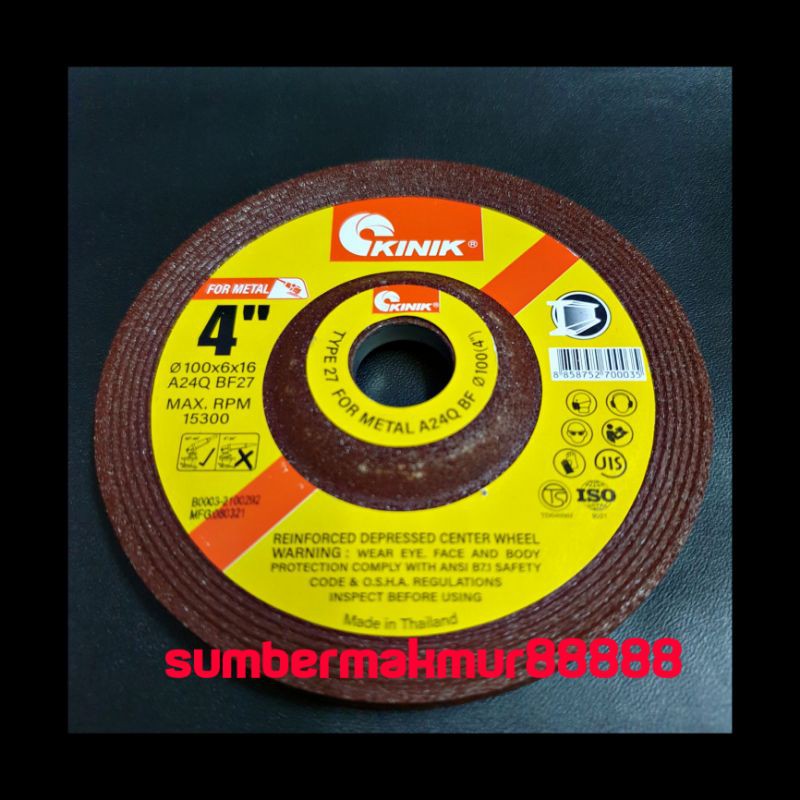 Batu gurinda merk kinik untuk merapihkan permukaan ya g berbahan besi. Seperti merapihkan bekas permukaan las an / potongan besi.Diamter batu : 4inchTebal batu 6mmBuatan tha