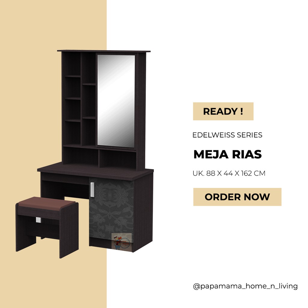 Produk tersedia di kota MedanPengiriman luar kota akan dikenakan biaya pengiriman dan akan menjadi tanggungan customer.Meja RiasMerk : TOPPAN FURNITUREMeja Rias EdelweissMeja rias minimalis Terdapat Laci buat menaruh barang anda.Kaca cermin besar.Bahan produk berkwalitas Dimensi : 88 x 44 x 162 cmWajib diperhatikan :* untuk item yang pre order memerlukan waktu pengerjaan 4-14Hri kerja.* untuk Luar kota dimohonkan untuk mengkonfirmasikan lokasi pengiriman terlebih dahulu dikarenakan berat yang tertera bukanlah berat yang sebenarnya*Biaya expedisi sepenuhnya menjadi tanggungjawab dari pihak Customer.Untuk lebih lengkapnya Dihimbau untuk mengkonfirmasikan terlebih dahulu sebelum membeli.Happy Shopping GuysSilahkan kunjungi kami :Papamama Home N LivingJl. Danau Singkarak Ujung / Gaperta No 4/8B MedanSeberang Ex M