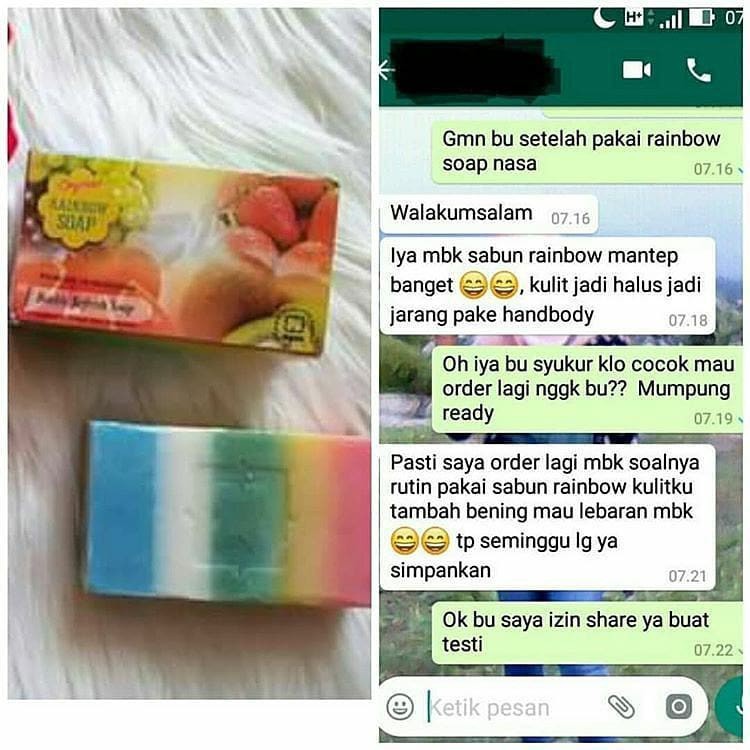 Orysoap Rainbow SoapSebuah inovasi kami hadirkan dalam satu produk yang inovatif, menggabungkan berbagai manfaat dalam satu genggaman.Kebaikandari fragrant juice buah-buahan (strowberi, orange, kiwi,anggur) yang di padukan dengan kelembutan susu dan olive yang terpadu menjadi satu, sehingga kombinasi ini memberikan manfaat double refresh yang sangat unik.Manfaat Sabun Rainbow:Membantu mencerahkan kulit 10x lebih baik di banding sabun gluta karena memiliki kandungan lebih dari pada jenis sabun glutaMampu memudarkan jerawat dan bekas luka, jadi akan hilang secara bertahapMenjadikan kulit tampak lebih glowingMeraakan dan mencerahkan warna kulit yang terpapar sinar matahariMelembabkan kulit dan menjadikan kulit sehat dan kenyalSebagai aromatherapy yang unikMemiliki daki banyak? jangan khawatir karena sabun ini mampu membuat kulit lebih halus dengan fungsinya sebagai perontok daki yang menempel pada kulitMampu membuat kulit lebih lembab dan mendapatkan kulit putih secara merata, karena biasanya ada jenis muka yang berbeda warnanya antara bagian satu dengan yang lainnya.Cara pemakaian Sabun Rainbow:Gunakan pada saat mandi dengan cara gosokkan sabun keseluruh badan dan bilas dengan air b
