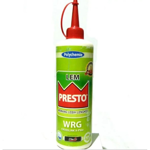 Lem Presto WRG adalah lem kayu teknologi Aliphatic seperti PRESTO DN, namun telah ditambahkan FITUR TAHAN AIR, sehingga cocok untuk EKSTERIOR.Perbedaan paling menonjol dari lem aliphatic apabila dibandingkan dengan lem PVAc biasa adalah ketahanan tinggi terhadap solvent seperti thinner yang seringkali digunakan untuk mempersiapkan permukaan kayu untuk proses finishing dan juga tidak akan menempel pada amplas pada saat kering sehingga dapat menghemat pemakaian amplas. Selain itu, lem aliphatic telah diformulasikan untuk memiliki warna krem yang menyerupai warna kayu yang ditempel, beda dengan lem PVAc yang memiliki warna putih. Dan kecepatan keringnya yang lebih cepat dari lem PVAc biasa. Apalagi lem Presto WRG ini tahan air.Lem Presto WRG juga telah lulus sertifikasi JAIA F**** dari Jepang dan CARB Phase 2 dari USA. Dengan memakai Lem Presto WRG, anda berarti telah menciptakan furniture kayu menggunakan lem berstandar internasional dan sekaligus membantu menjaga kesehatan keluarga customer anda yang akan menggunakan furniture kayu buatan anda untuk 20-30 tahun ked